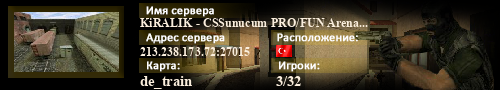 | Статус : Включен | Страна Адрес сервера : 213.238.173.72:27015 Игра : Counter-Strike Карта : de_train Игроки : (3)3 / 32 | Загружен на : Сайт сервера : Не задан Обновлен в : 00:06 | Пинг : 71 мс | Версия : 1.1.2.7/Stdio ОС: Linux | VAC - Secured | ||