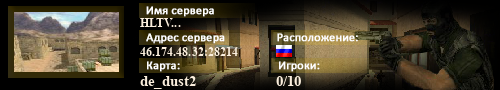 | Статус : Включен | Страна Адрес сервера : 46.174.48.32:28214 Игра : Counter-Strike Карта : de_dust2 Игроки : 0 / 10 | Загружен на : Сайт сервера : Не задан Обновлен в : 23:50 | Пинг : 16 мс | Версия : l ОС: Windows | VAC - Secured | ||