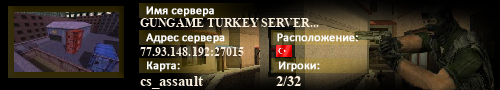 | Статус : Включен | Страна Адрес сервера : 77.93.148.192:27015 Игра : Counter-Strike Карта : cs_assault Игроки : 2 / 32 | Загружен на : Сайт сервера : turkuazforum.com Обновлен в : 10:51 | Пинг : 85 мс | Версия : 1.1.2.7/Stdio ОС: Linux | VAC - Secured | ||