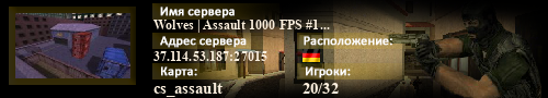 | Статус : Включен | Страна Адрес сервера : 37.114.53.187:27015 Игра : Counter-Strike Карта : cs_assault Игроки : 20 / 32 | Загружен на : Сайт сервера : Не задан Обновлен в : 10:30 | Пинг : 40 мс | Версия : olves-cs.com ОС: Windows | VAC - Secured | ||