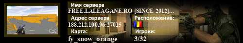 | Статус : Включен | Страна Адрес сервера : 188.212.100.96:27015 Игра : Counter-Strike Карта : fy_snow_orange Игроки : 3 / 32 | Загружен на : Сайт сервера : zonecs16.eu Обновлен в : 23:01 | Пинг : 185 мс | Версия : trike ОС: Windows | VAC - Secured | ||
