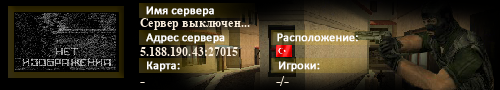 | Статус : Выключен | Страна Адрес сервера : 5.188.190.43:27015 Игра : Counter-Strike Карта : - Игроки : - / - | Загружен на : Сайт сервера : Не задан Обновлен в : 23:13 | Пинг : 0 мс | Версия : 0.0.0 ОС: Windows | VAC - Secured | ||