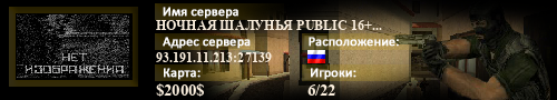 | Статус : Включен | Страна Адрес сервера : 93.191.11.213:27139 Игра : Counter-Strike Карта : $2000$ Игроки : 6 / 22 | Загружен на : Сайт сервера : Не задан Обновлен в : 21:52 | Пинг : 2 мс | Версия : ?кам Vip ОС: Windows | VAC - Secured | ||