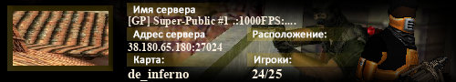 | Статус : Включен | Страна Адрес сервера : 38.180.65.180:27024 Игра : Counter-Strike : Source Карта : de_inferno Игроки : (1)24 / 25 | Загружен на : Сайт сервера : Не задан Обновлен в : 15:01 | Пинг : 65 мс | Версия : 1.1.2.7/Std ОС: Linux | VAC - Secured | ||