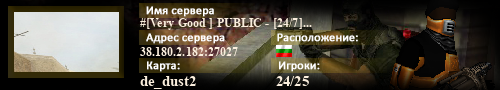 | Статус : Включен | Страна Адрес сервера : 38.180.2.182:27027 Игра : Counter-Strike : Source Карта : de_dust2 Игроки : (1)24 / 25 | Загружен на : Сайт сервера : Не задан Обновлен в : 15:02 | Пинг : 83 мс | Версия : 1.1.2.7/Std ОС: Linux | VAC - Secured | ||