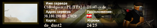 | Статус : Включен | Страна Адрес сервера : 38.180.198.88:27029 Игра : Counter-Strike : Source Карта : de_dust2 Игроки : (1)24 / 25 | Загружен на : Сайт сервера : Не задан Обновлен в : 00:57 | Пинг : 64 мс | Версия : 1.1.2.7/Std ОС: Linux | VAC - Secured | ||