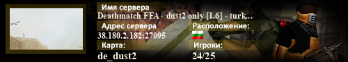| Статус : Включен | Страна Адрес сервера : 38.180.2.182:27095 Игра : Counter-Strike : Source Карта : de_dust2 Игроки : (1)24 / 25 | Загружен на : Сайт сервера : Не задан Обновлен в : 10:03 | Пинг : 81 мс | Версия : 1.1.2.7/Std ОС: Linux | VAC - Secured | ||