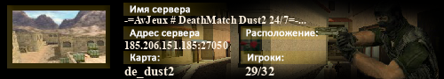 | Статус : Включен | Страна Адрес сервера : 185.206.151.185:27050 Игра : Counter-Strike Карта : de_dust2 Игроки : 29 / 32 | Загружен на : Сайт сервера : Не задан Обновлен в : 00:00 | Пинг : 53 мс | Версия : 1.1.2.7/Stdio ОС: Linux | VAC - Secured | ||