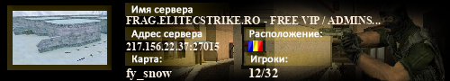 | Статус : Включен | Страна Адрес сервера : 217.156.22.37:27015 Игра : Counter-Strike Карта : fy_snow Игроки : 6 / 32 | Загружен на : Сайт сервера : https://www.elitecstrike.ro Обновлен в : 13:39 | Пинг : 41 мс | Версия : 1.1.2.7/Stdio ОС: Linux | VAC - Secured | ||