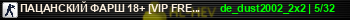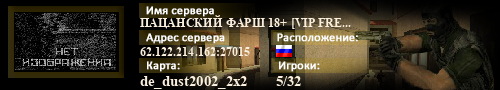 | Статус : Включен | Страна Адрес сервера : 62.122.214.162:27015 Игра : Counter-Strike Карта : de_dust2002_2x2 Игроки : 5 / 32 | Загружен на : Сайт сервера : MATRICACS.RU Обновлен в : 21:33 | Пинг : 3 мс | Версия : 1.1.2.7/Stdio ОС: Linux | VAC - Secured | ||