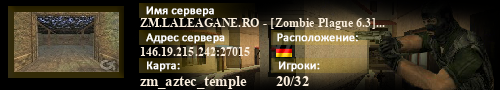 | Статус : Включен | Страна Адрес сервера : 146.19.215.242:27015 Игра : Counter-Strike Карта : zm_aztec_temple Игроки : 20 / 32 | Загружен на : Сайт сервера : https://laleagane.ro/forum/zm/ Обновлен в : 22:36 | Пинг : 41 мс | Версия : 1.1.2.7/Stdio ОС: Linux | VAC - Secured | ||