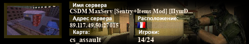 | Статус : Включен | Страна Адрес сервера : 89.117.49.50:27015 Игра : Counter-Strike Карта : cs_assault Игроки : (14)14 / 24 | Загружен на : Сайт сервера : steamcommunity.com/groups/maxserv/edit/profile Обновлен в : 23:42 | Пинг : 54 мс | Версия : 1.1.2.7/Stdio ОС: Linux | VAC - Secured | ||
