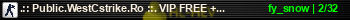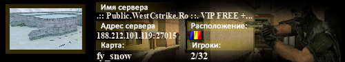 | Статус : Включен | Страна Адрес сервера : 188.212.101.119:27015 Игра : Counter-Strike Карта : fy_snow Игроки : (2)2 / 32 | Загружен на : Сайт сервера : westcstrike.ro/forum Обновлен в : 23:47 | Пинг : 79 мс | Версия : 1.1.2.7/Stdio ОС: Linux | VAC - Secured | ||